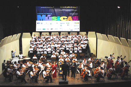 Depois de duas semanas de intenso trabalho, os 80 alunos que participaram da “oficina de prática de coro”, ministrada pelo professor Wladimir Silva, da Paraíba, apresentam-se no concerto de encerramento do 29° FML.